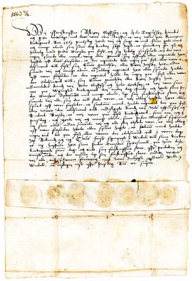 Vidnesbyrd af 2 Mænd om, at Peder Toresøn paa Fos Pindsedag 1563 paa Konaxmo Kirkegaard adspurgte den samlede Almue om nogen vidste eller mindedes at have hørt, at der nogen Tid boede paa Fos eller var Odelsmand dertil Gunnar Gamalsøn el. Biørn Jonsøn; men alle svarede Nej. Ganske det Tilsvarende bevidne 2 andre Mænd at være sket den følgende Dag paa Wimosted Kirkegaard, og igjen 2 Andre ligeledes den derefter følgende Dag paa Foss Kirkegaard. Orig. Papir. 7 paatrykte Segl. | ||
