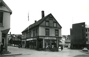 I gården var også kiosk og glassvaremagasin. Brødrene Skar hadde barberforretning her i 1932.