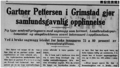 I januar 1940 omtalte Agderposten Petersens eksperimenter med å utvikle en sentralfyringsovn som kan bruke sagmugg som brensel. Gartneren tok patent på sin ovn. Både Landbruksdepartementet og Skogdirektøren var svært interesserte i oppfinnelsen. Petersen anslår at man kan spare 75 - 80% av brenselsutgiftene om man skifter fra koks til sagmugg.