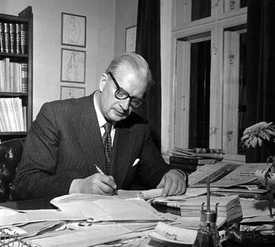 | Han var ikke bare tegner. Han var skribent. Observatør. I en hemmelighetsfull forstand av ordet var han også kommentator. ... Han hadde ikke lært det noe sted. I akademisk forstand var han en uutdannet tegner. Talentet var genuint til gjengjeld. Gladelig kunne kan bryte med estetiske regler, som andre tegnere underlegger seg, med flid! ... Et kjennetegn ved karakteriseringskunsten hans er at de små skjevhetene, de neste grove stiliseringene av visse trekk, tilsammen blir forbløffende sannferdige. .. Uten noen av det vi ellers kaller kunstnerisk ærgjerrighet, skapte han kunst i massevis, nervepirrende profesjonelt, ubestikkelig. Hver dag. | ||
