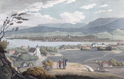 Gamlebyen malt omkr. 1800. På venstre side Oslo hospital med kirken, på høyre side Oslo ladegård. I bakgrunnen ligger Akershus festning og Christiania.