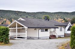 | 17 | Gnr. 77/22, «Mo». Huset blei sett opp av Hans Laskemoen i 1925. Opprinnelsen til huset var ei lita eldre stuge som han flytte frå Røte på Roteberga i Bø. Han bygde på den gamle tømra og dreiv skysstasjon og kafé her, og i 1920-åra var det dansetilstelningar i andre etasje. I 1930 kjøpte Andrea og Olav Knutsen eigedomen og dreiv landhandel og mjølkeutsalg. Sonen Gregert dreiv transportfirma her, og butikken blei seinare overtatt av han og kona, Aasta som dreiv mjølkeutsal og kiosk fram til slutten av 1970-talet. Sidan har huset vore bustad og atelier. Bygningen fekk etter kvart fleire elementer av empirestil. | |