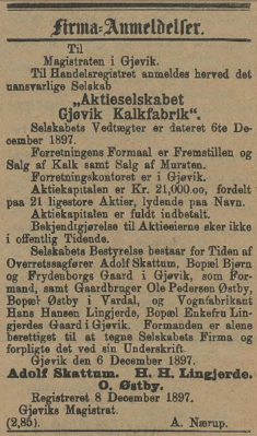 Kalkfabrikken ble satt i drift i 1897 etter initiativ av overrettssakfører Adolf Skattum, vognfabrikant Hans H. Lingjerde og gardbruker Ole Østby. I 1912 ble Lingjerde eneeier av fabrikken. Bedriftens lager og kontor ble lokalisert sammen med Gjøvik vognfabriks utsalg i Strandgata i Gjøvik sentrum.