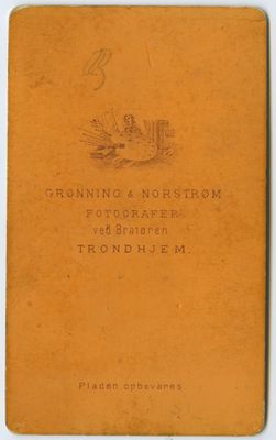Bakside av fotografi (carte de visite) fra Grønning & Norstrøm. Fra Åsen Museum og Historielags samlinger (kopi – original i privat eie).