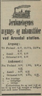 Ved storthingsbeslutning af 20de mai 1899 er bevilget som tilskud af statskassen 368 000 kr. til en tertierjernbane Grimstad—Mæsel i Froland. Banen antages at ville koste 736 000 kr., saa at halvdelen er statsbidrag.