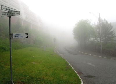 Motiv fra Grindbakken i Oslo en tåkefull junidag.
