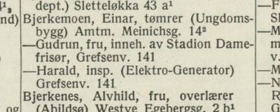 Utsnitt fra adresseboka for Oslo 1970/71. Gudrun Bjerkemoen var «inneh. av Stadion Damefrisør».
