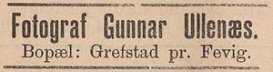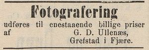 "G. D. Ullenæs" annonserer sin fotografiske virksomhet i Grimstad adressetidende 4/7/1891. Han er da i arbeid (bosatt?) på Grefstad.