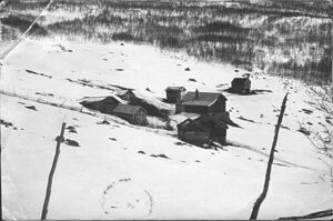 Garden Randen, 950 moh., 7 km til nemmaste granne, påska 1945. Snøen dølgjer store arbeidsrøyser og lange dreneringsgrøfter. Ukjent fotograf.