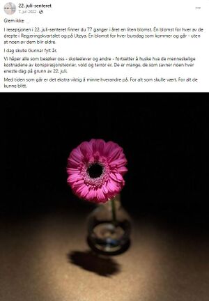 I resepsjonen i 22. juli-senteret finner du 77 ganger i året en liten blomst. Én blomst for hver av de drepte i Regjeringskvartalet og på Utøya. Én blomst for hver bursdag som kommer og går - uten at noen av dem blir eldre. I dag skulle Gunnar fylt år. Vi håper alle som besøker oss - skoleelever og andre - fortsetter å huske hva de menneskelige kostnadene av konspirasjonsteorier, vold og terror er. De er mange, de som savner noen hver eneste dag på grunn av 22. juli. Med tiden som går er det ekstra viktig å minne hverandre på. For alt som skulle vært. For alt de kunne blitt.[5] | ||