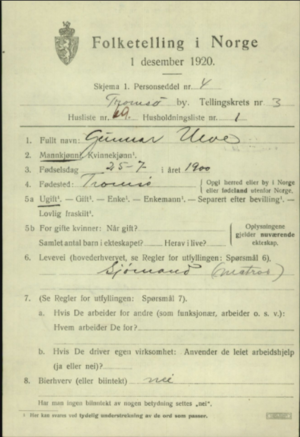 - Gunnar Ulve i folketelling 1920 for Tromsø kjøpstad fra Digitalarkivet