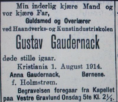 I folketellingen for Aker herred for 1910 er Gaudernack registrert med tittelen Lærer ved kunst og håndverkskolen med bosted Granheim i Ullern, sammen med kona Anna og seks barn.