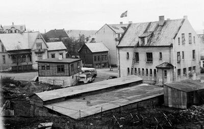 | 8 | Det opprinnelige huset her ble bygd av malermester L. Leiknes i 1912. Det ble revet for å gi plass til det nye politihuset. Skiltet (på bildet til venstre) sto på den tidligere politistasjonen i Grand-bygget. Bak huset ser vi Kind-gården, som også ble revet. Det lille huset som tjente som barneparkering, måtte vike plassen for Grottebadet. |