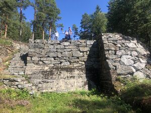 Fra nedre mot midtre nivå. Her ser vi at nedre del er støpt betong - dette sies å være første gang sement ble benyttet i Fet.