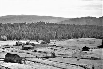 | Nærmest bruket Nyland, bak plassen Høiby med nytt gult bolighus, og bakerst til høyre småbruket Solbakken.