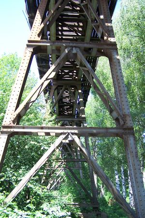 Jernbanen kom til Hølen i 1879. Viadukten, kjent lokalt som «Hølensbroa», stod ferdig i 1878 og ble testet med tunge grusvogner samme år før den kunne åpnes. Jernbroen ble bygget med pendelpillarprinsippet, der pillarene har et ledd ved foten og et ved toppen slik at de kan svinge med broens bevegelser og dermed minske belastningene på konstruksjonen. Da den ble åpnet av kong Oscar II hadde ikke passasjervognene nådd frem enda, og kongen måtte ta til takke med en grusvogn som man hadde satt opp et telt på.