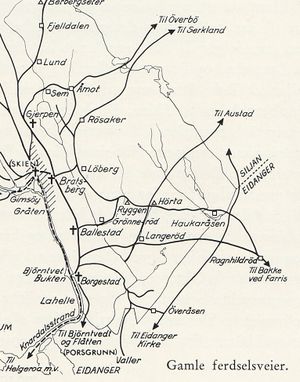 En vei gikk nord-syd fra ytre Gjerpen over Langerød forbi Hørta videre forbi Skifjell og til Austad i Siljan. Den kan man lese mer om i Torgeir Strand "Den gamle rideveg til Slemdal"