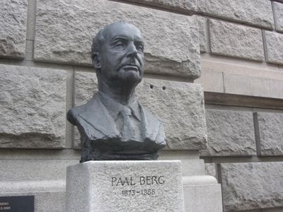 Byste av høyesterettsjustitiarius Paal Berg utenfor Høyesteretts hus i Oslo. Berg er den lengstsittende justitiarius.