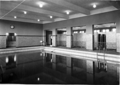 | Det er et vakkert anlegg Halden har fått i dette bad. Der er karbad, medisinske bad, badstue og svømmebasseng, alt fullt moderne med tiltalende og tidsmessig utstyr. ... Som badet står i dag koster det kr. 310.000. Bygningen er 29, 5 m. lang, 18,5 m. bred og 545 kvm. bebygget areal. De forskjellige avdelinger er installert i to etasjer med det tekniske anlegg i kjelleren. Der er 4 varmtvannsbeholdere, som hver rummer 6000 liter. Badets interiør er gitt vekslende og friske farger. En foranstaltning, som vil vekke særlig opmerksomhet er et spesielt avklædningsrum for skoleklasser, som under opsyn besøker badet. | ||