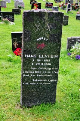 NOREG (i boge) * HANS ELVHEIM * 16-1.1912 * 26-9.1940 * Var friviljug med * i Krigen 1940-1945 og ofra * livet for fædrelandet. * Takksame bygde- * folk reiste steinen.