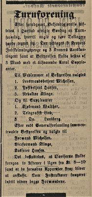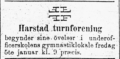 Men, som vi ser av kunngjøringen i Tromsø Amtstidende den 14. november 1891, ble det allerede 8. november i 1891 stiftet en turnforening i Harstad, «der nogleogtyve deltagere hadde tegnet sig». Formann var lensmannsbetjent Michael Mikkelsen (senere lensmann). Kan hende har denne foreningen ikke klart brasene og lagt ned, for så å gjenoppstå i 1898?