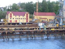 Samasjøen var lenge et betydelig industriområde der Kristian Holst drev mangfoldig forretningsvirksomhet. Bryggen til venstre er opprinnelig fra Gullvik på Store-Mola i Lofoten og ble først flyttet til Leirvåg i Bjarkøy, så ca. 1860 til Steinavær i Andfjorden, der Ditlev Wibe Lund hadde fiskemottak, sildsalteri og landhandel. I 1917 ble brygga oppkjøpt av Kristian Holst og plassert i Samasjøen. Der ble den påbygd en eller to etasjer. Bygget til høyre er tidligere Hindø Canning, oppført i 1919. Det ble drevet hermetikkvirksomhet her ennå i 1960-årene. I dag (2016) er det Harstad Mek. Verksted AS som eier bryggene og annonserer at de gjerne vil avhende dem med formål å flytte og bevare dem. I bakgrunnen skimtes boligen til Kristian Holst på Rabben. Foto: Gunnar Reppen 2009.