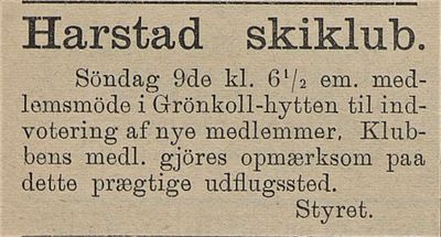 6. juli annonseres medlemsmøte «i Grönkoll-hytten til indvotering av nye medlemmer» - og «Klubbens medlemmer gjøres opmærksom paa dette prægtige udfluktssted». Av dette må det være lov å slutte at det var Harstad skiklub som fikk bygd hytta i Grønnkollen, men fortsatt gjenstår å finne ut hvem som sto for bygginga og når den ble ferdigstilt.