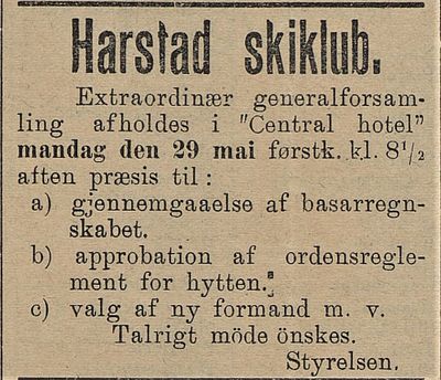 Fra et referat i Tromsø Amtstidende av 3. februar 1898 ser vi at Harstad skiklub hadde avviklet generalforsamling på Grand hotel "sistl. søndag", som da må ha vært søndag den 30. januar 1898.