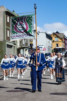 Harstad skoles musikkorps marsjerer nedover Strandgata i Harstad i anledning korpsets markering av sitt 60-årsjubileum, 2. juni 2012