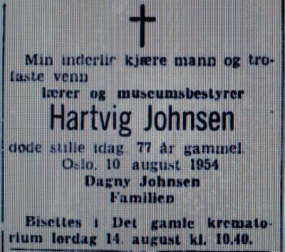 - Aftenposten 4. mars 1954: Artikkel om avduking av maleri av Hartvig Johnsen.