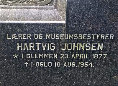 Hartvig Johnsen er gravlagt på Gamle Aker kirkegård i Oslo. Titlene Lærer og Museumsbestyrer er benyttet på gravminnet.