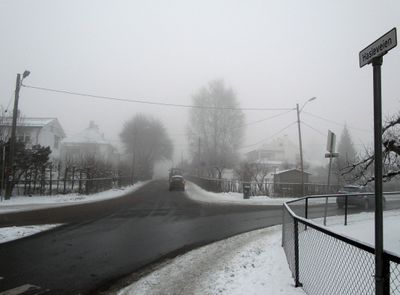 Motiv fra Hasleveien i tåke, sent i desember 2014.