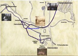 | Vannrenna går forbi Haslumhuset. Steinfundamenter for vannrenna. Kart som antyder hvor vannrenna var plassert i terenget. | ||