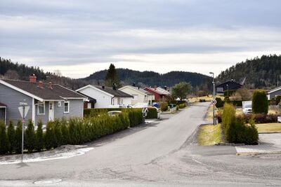 Haslunds veg sett vestover. Nr. 1 til venstre.