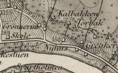 | Husmannsplassene Nyhusbakken og Hausen på O-kart fra 1982. I nordøst Tørbak under Nyhus og Kalbakken under Grønnerud. Kart fra Brandval/Kongsvinger O-klubb. | |