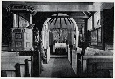 | Altartavle: | Altarskåp frå 1200-talet, oppmåla kring 1766 av Hovel Christopher Gaarder. |