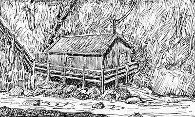 Ole Bergs tegning av elektrisitetsverket ved Heggshuselva. Faren Ole Kristian Berg bygde dette i 1911/12.
