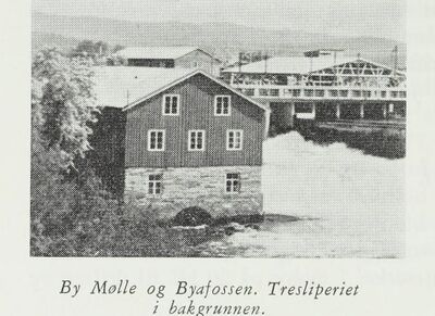 By gård hadde i mange år hatt kornmølle ved fossen, også på begge sider. Den første kjente på nordsiden var fra 1700-tallet, mens mølla på sørsiden, med navnet «Helge», ble lagt ned da tremassefabrikken ble bygget på dette stedet i 1897.