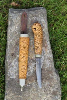 Det ble nok sjelden eller aldri gjort rent. Det luktet av skinn, av lær, av politur, av (?), tre og av ukokte og kokte gamle poteter. Der var stokkvegger og bjelketak, mørkebrunt av elde og røk, og i sprekkene i loftet var der innstukket pinner hvorpå der igjen var stukket knivskafter og knivslirer som var fernisert og nu sto under taket for å tørre. Det som lyste og var renest derinne var disse utskårne knivskafter og knivslirer, holkene og en og annen ny klokke.[38] | ||