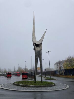 Kunstverket er laget av den norske grafikeren og billedhuggeren Thor Sandborg (f. 1942)[2]. Skulpturen veier 3 tonn og måler 1500 x 350 x 200 cm og står i rundkjøringen ved inngangen til kollektivterminalen fra motorveien.