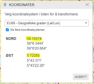 2. Koordinatsettet EU89 - Geografiske grader (Lat/Lon) på Norgeskart. Rett kode her vil vere: {{artikkelkoord|59.10574|N|5.72285|Ø}}.