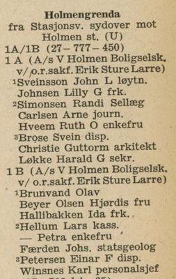 Utsnitt fra Oslo Adressebok for 1955, kort tid etter at veien fikk navn. Advokat Erik Sture Larre var forretningsfører for boligselskapene Holmengrenda 1A og 1B.