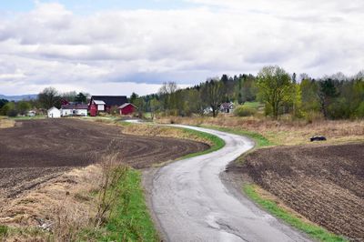Holmsvegen sett østover med nr. 32, Holm (gnr. 127/5). Veien ble lagt utenom gårdstunet i 2019–20.