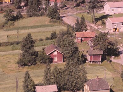 | Småbruket Holtbrenna i Kongsvinger kommune. Veien bak uthusene er Tajevegen og i nedre venstre bildehjørne ses Brennavegen. Foto: Widerøes Flyveselskap (1957).
