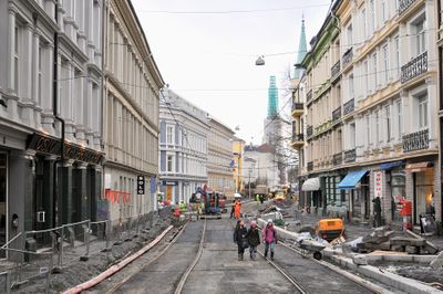 Holtegata. Oppgradering av trikkelinja gjennom Homannsbyen nærmer seg fullførelse. Linja åpnet for trafikk to dager etter.