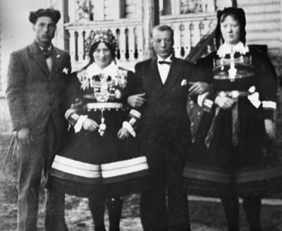 Angjerd Rygnestad og Odd Byklum då dei gifte seg 8. mai 1945. Forlovarane, som flankerer brureparet på biletet, er Mikkel T. Haugen og Gyro T. Homme, gift Sollid. Bilete frå Ingebjørg Vegestog.