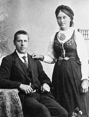 Kjetil og Torbjørg Hovden. Brurebilete 1910. Torbjørg ber den såkalla Fjellgardsdrakta, som vart moderne frå ca 1890 og frametter. Visstnok var det nokre handarbeidslærarinner på folkehøgskulen i Seljord som introduserte denne modellen. Bilete frå Tone Uleberg via Ingebjørg Vegestog.
