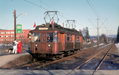 - Østgående tog har forlatt stasjon, sett fra vestgående perrong. Deler av daværende bygnineger til Persbråten videregående skole til høyre.Foto: Sverre Okkenhaug/Oslo Museum (1978).