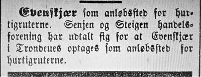 I 1880 vurderte Indredepartementets Dampskibskonsulent mulighetene for en ekspressrute nordover fra Trondheim i tilknytning til jernbanen Kristiania-Røros-Trondheim. En rute mellom Trondheim og Tromsø med to seilinger i uken ville kreve fem skip. Dette ble imidlertid ansett som for kostbart, og prosjektet ble skrinlagt.