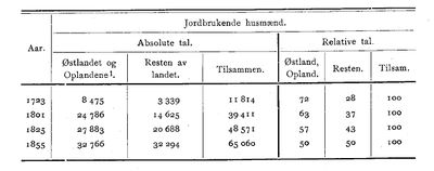 + Tabell 1: Endring i antall husmenn og gårdbrukere over fra 1723 til 1825.[29]